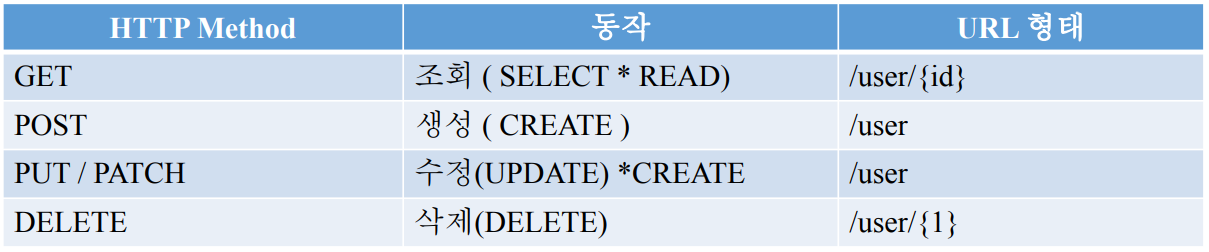 - HTTP Method 를 통해서 Resource를 처리 한다.